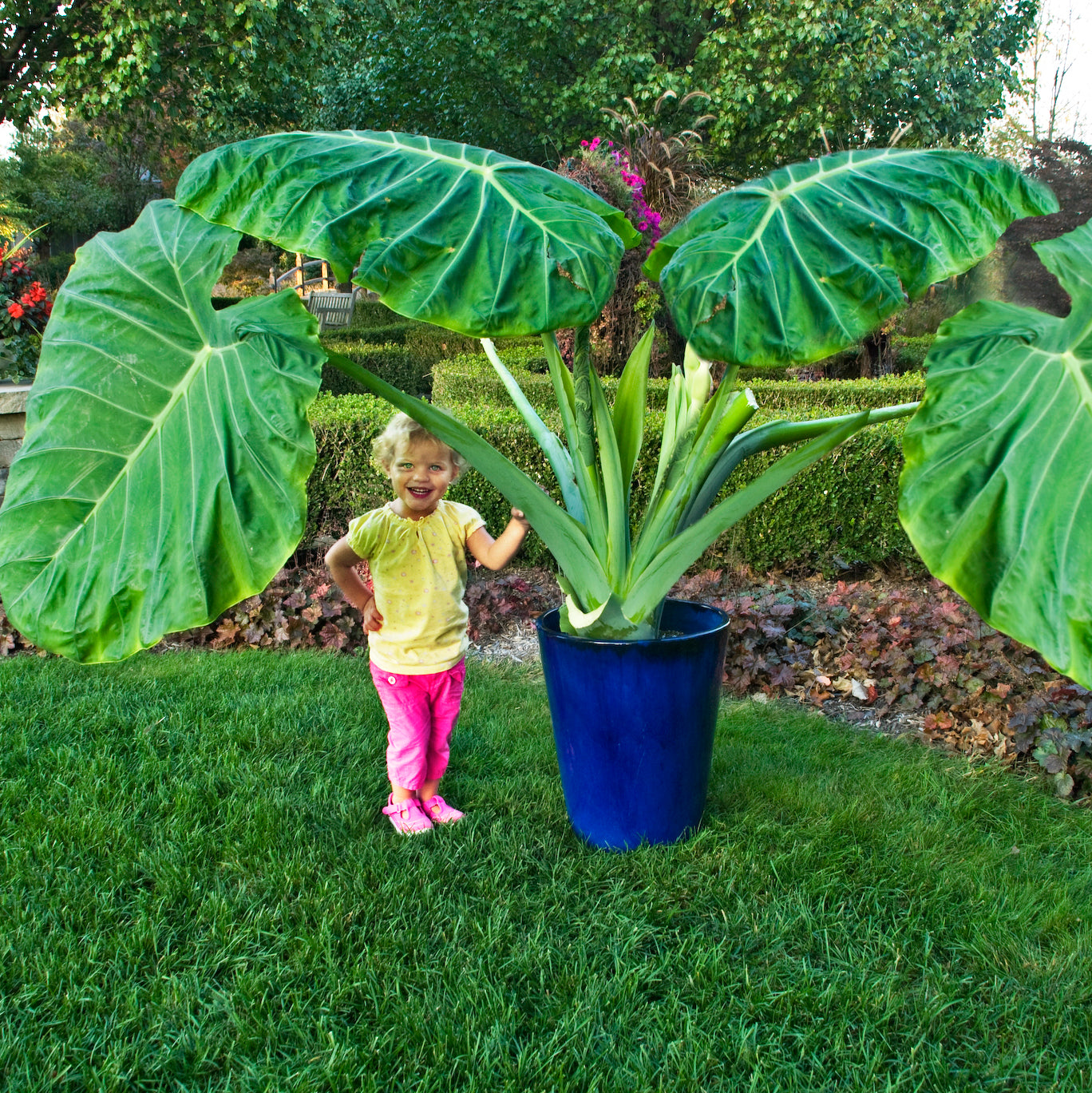 To say that this plant will dwarf any plant you already own would be putting it mildly! ‘Thailand Giant’ is much larger than C. gigantea. Its glaucous green leaves can measure a whopping 5' long x 4' wide each. Full grown plants typically reach 9ft tall, though some grown in tropical climates have reportedly reached 20'. Ships as a live plant in a 4" pot